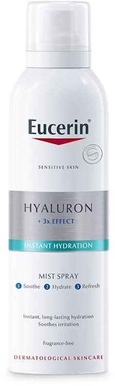 Instantly refresh dry, dull facial skin, wherever you are. This facial mist spray with Hyaluronic Acid and Gluco-Glycerol supports instant and long-lasting hydration for smooth and radiant skin. __Benefits:__ - Eucerin Hyaluron-Filler Mist Spray 150ml, for instant long-lasting hydration - Soothes irritation due to dryness - For all skin types - Instant and long-lasting hydration from within with a 3x Effect: soothes, refreshes, hydrates - Clinical and dermatological studies prove high efficacy even on sensitive skin - Nature-identical Gluco-Glycerol helps to activate skin’s own moisturisation