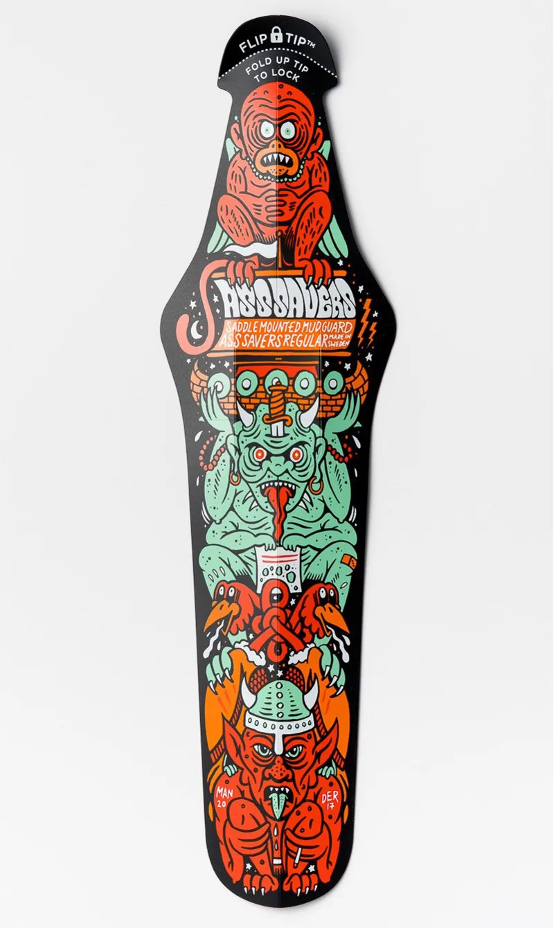 The new Kollection Series is a brand new project from Ass Savers, and the first Kollaborator is Swedish illustrator Mander. Martin Ander has created a name for himself as a unique artist with an eye for details. The style is deeply rooted in 70's comics, mashed up with graffiti and dark humor references. Martins work includes everything from underground club flyers to doctors dissertations. In recent years, his sharp pen has caused quite some international stir and some of his latest work features album covers for hiphop legend KRS-One and t-shirt prints for the synthesizer gurus at MOOG. We love the quirky details in his artworks and his precision in the selection of objects and contexts. There's always an extra layer of twisted hints that doesn't show at first sight. In our opinion it's the storytelling qualities that makes Martin a great illustrator and not only a perfectionist executor of style. Staffan Weigel, founder Ass Savers I have always had respect for companies that have an aesthetic thought with their products. After my first conversation with Ass Savers, I immediately understood that we will be able to create magic together. I am proud to present my work for the cycling world through Ass Savers mudguards. Martin Ander, illustrator The MANDER Kollection features four custom designed ASS SAVER Regular fenders. Want to find out more about Mander? Check out the full report from Ass Saver. Ass Saver Regular x Mander Features First in the new Kollection Series Limited Edition Patented FLIP-TIP™ attachment system Easy to mount, requires no tools Suitable for tire widths between 23-35 mm