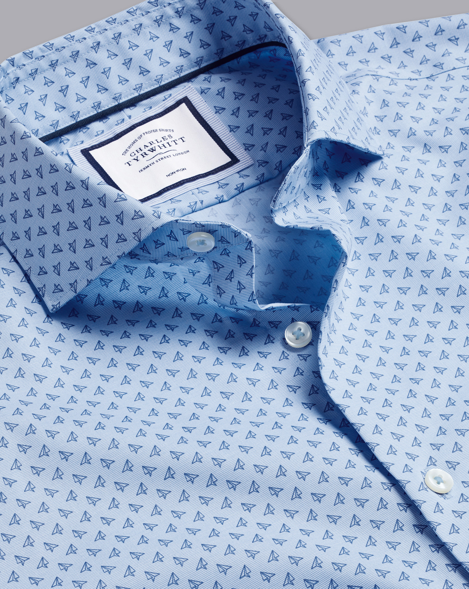 100% cotton, Available in slim and extra slim fit, Semi-cutaway collar, Rounded single cuff with two buttons, Complimentary brass collar stiffeners, Split back yoke, Navy back neck piping and contrast trim detailing, Machine washable - Cotton Semi-Cutaway Collar Non-Iron Paper Aeroplane Print Shirt - Sky Blue