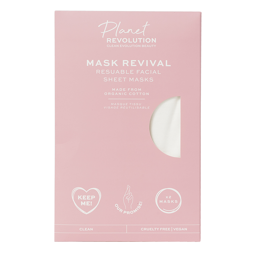 A set of two reusable facial sheet masks.Say goodbye to single use sheet masks and hello to the Plant Revolution Reusable Facial Sheet Masks. Made with organic cotton; these reusable sheet masks are completely washable and work with your favourite toning essences; mists or sheet mask waters. Vegan Cruelty free Contains two sheet masks