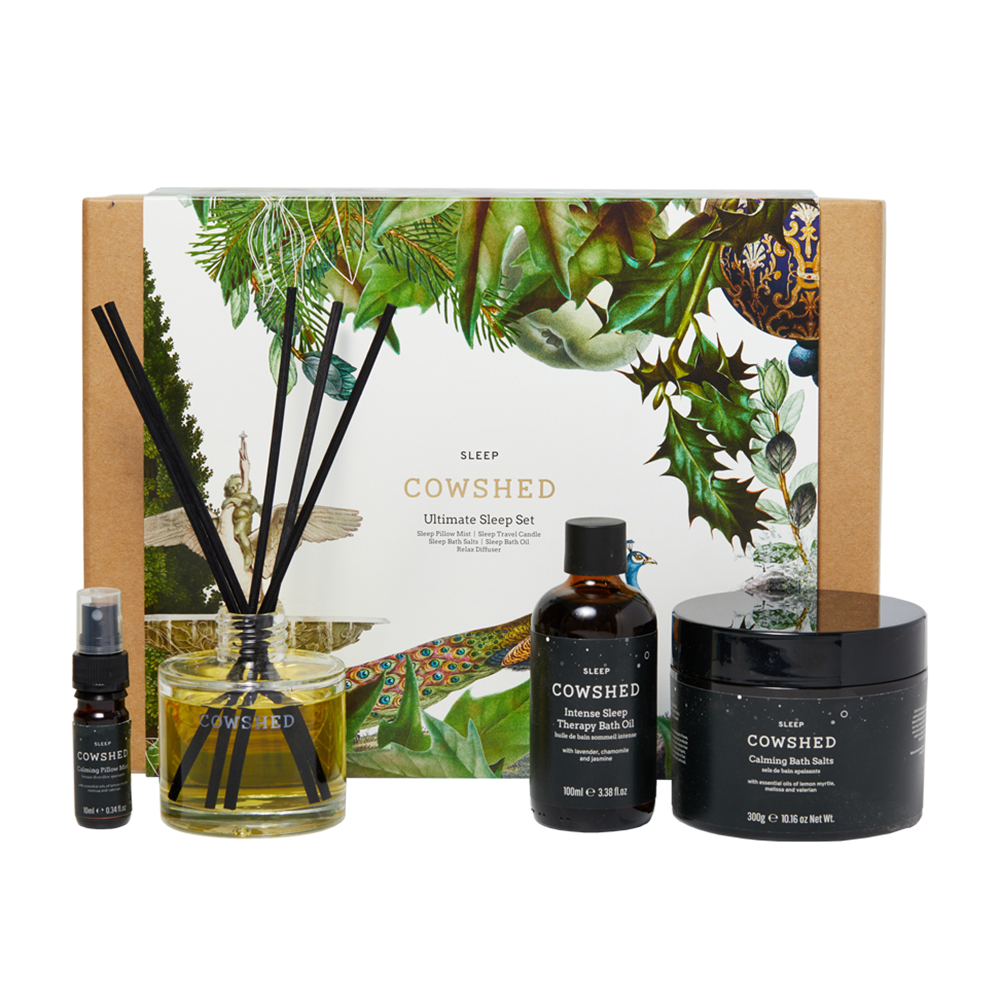A fivepiece sleep gift set. Cowshed know there is no better gift than the gift of great sleep; that’s why they created the Ultimate Sleep Set. Featuring five essential sleep products to help create the ultimate wind down routine for a great night’s sleep; the set is perfect for helping you switch off. With the Sleep Candle to create a calming atmosphere; the Sleep Bath Oil and Sleep Bath Salts to relax the body and mind; the Pillow Spray to help you drift off; and the Relax Diffuser to induce relaxation and improve sleep. Cruelty free Set Includes: Pillow Spray; 100ml A calming pillow mist with a blend of melissa and lemon myrtle essential oils. Sleep Candle; 140g A candle with scents of lavender; chamomile; geranium; frankincense; and jasmine. Sleep Bath Oil; 100ml A bath oil with lavender; chamomile; geranium; frankincense; and jasmine to help reduce feelings of anxiety and stress. Sleepy Bath Salts; 300g Himalayan salt and sea salt with vitamin E and squalene. Relax Diffuser; 100ml – A diffuser with a calming blend of lavender and eucalyptus.