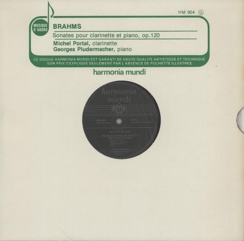 BRAHMS Sonates Pour Clarinette Et Piano Op. 120 (1977 French issue of the 1969 stereo LP in Harmonia Mundis Musique DAbord series starring Michel Portal [clarinet] & Georges Pludermacher [piano]. Comes housed in a custom printed die-cut sleeve complete with two inserts. The vinyl still looks barely played HMU904) Sonate En Fa Mineur Op. 120 N° 1 (24:50)A1 Allegro Appassionato 8:25A2 Andante Un Poco Adagio 5:58A3 Allegretto Grazioso 4:37A4 Vivace 5:38Sonate En Mi Bémol Majeur Op. 120 N° 2 (20:52)B1 Allegro Amabile 8:16B2 Allegro Appassionato 5:29B3