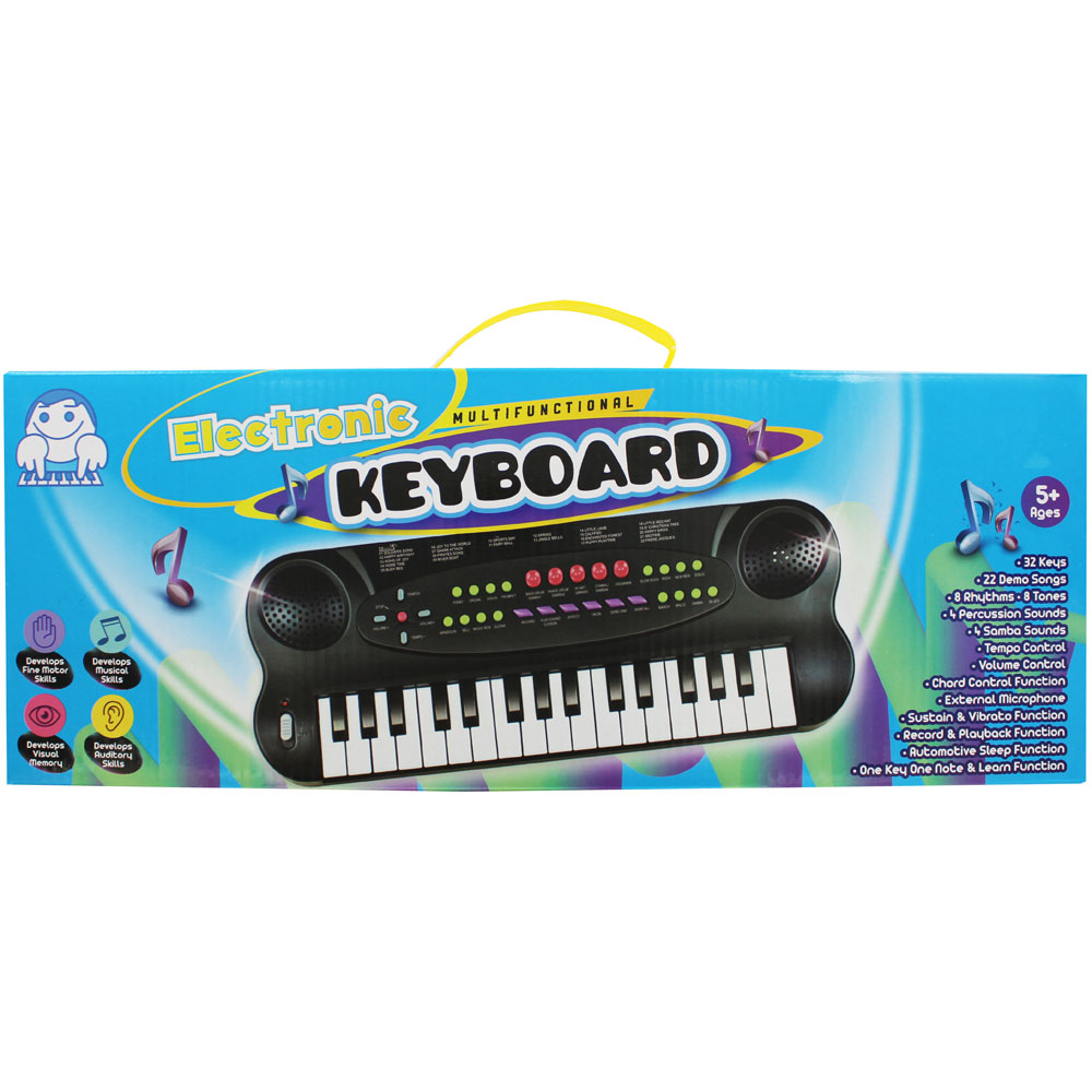 Get your youngsters into music with this brilliant Electronic Keyboard. Various sounds and demo songs encourage little ones to experiment as they invent their own unique sound! Features: • 32 keys• 22 demo songs• 8 rhythms• 8 tones• Tempo control• Volume control• Chord control function• External microphone• + much more Perfect for introducing your little ones into making music, finding a rhythm and so much more. Product Information:• Electronic Keyboard• Colour: Black• Musical fun• Requires: 4 x AA batteries• Measures: 40 x 15 x 5cm• Ages 5+