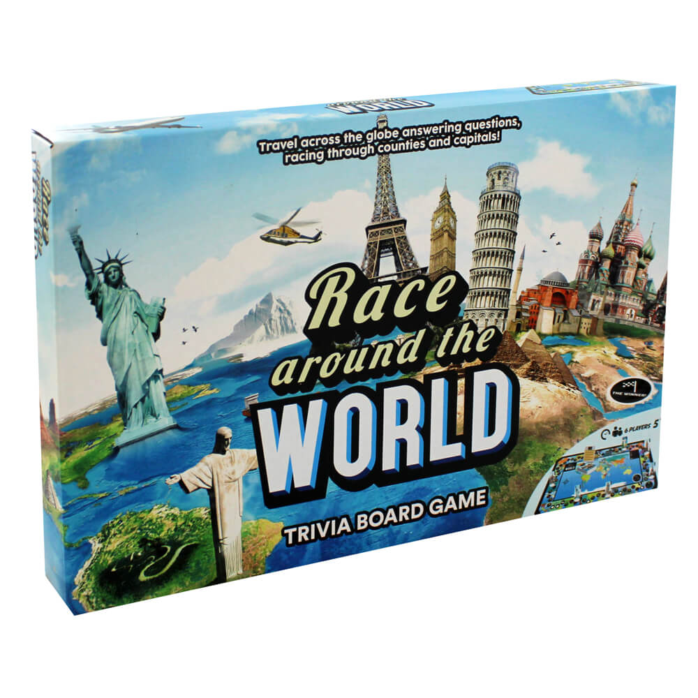 Answer questions to race your way around the globe, through cities, far off countries and spectacular landmarks! Includes: • 200 x Game cards • 6 x Stand up counters • 1 x Game board • 1 x Dry eraser marker • 1 x Wipe clean score board • Instructions There are many pitfalls along the way to avoid, like a ship that goes missing, a slow trains and a disastrous trip on a hot air balloon. If your knowledge of the world is spot on, you might just win the race around the world! Product Information: • Race Around the World Trivia Board Game • Trivia Board Game • Players: 6 • Ages: 5+