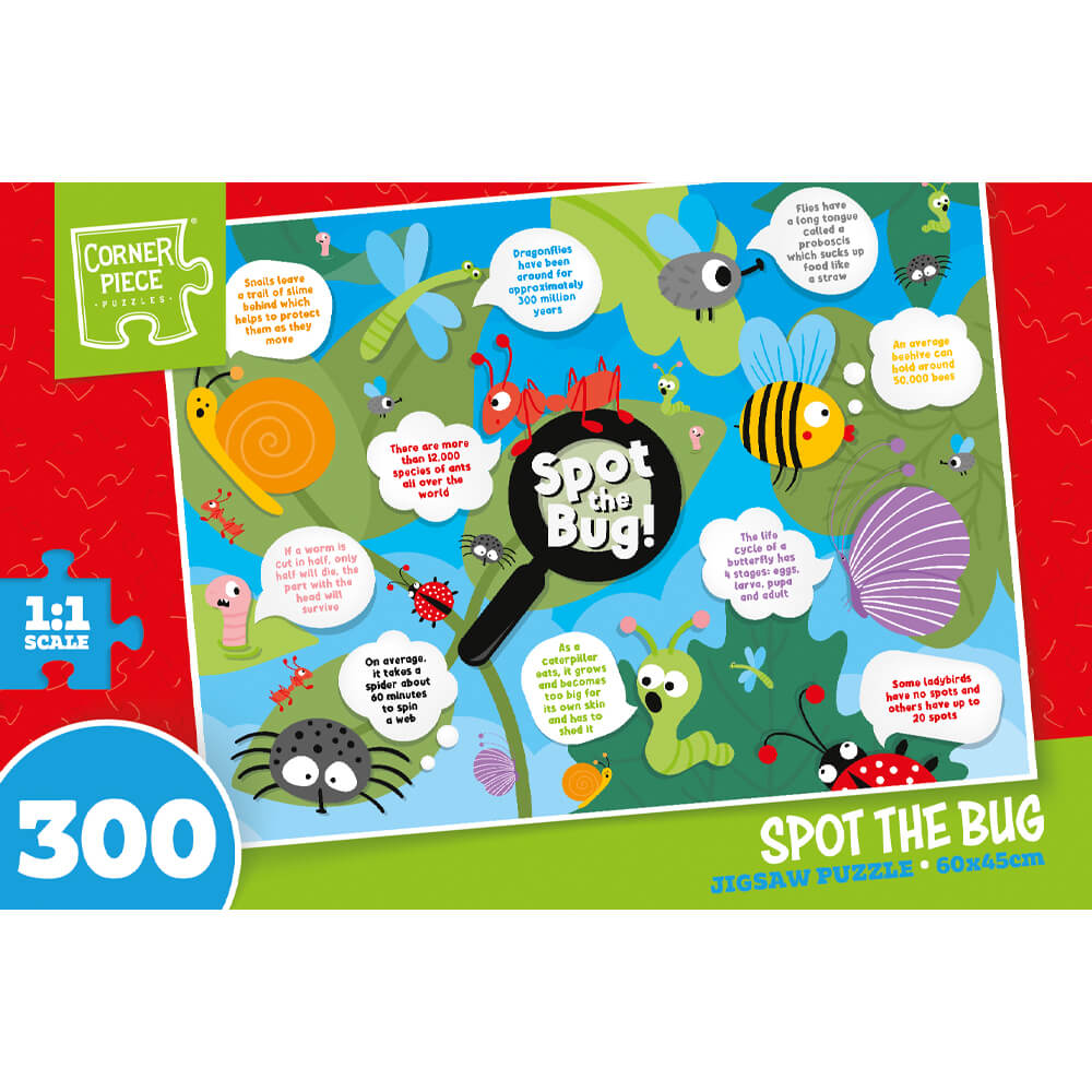 Learn all about lots of different species of bugs with this super colourful and informative Spot the Bug 300 Piece Jigsaw Puzzle. With 300 high quality pieces and an eye-catching image featuring lots of bug facts, this puzzle is sure to be a hit with curious youngsters. A brilliant challenge perfect to complete on your own or with friends and family. Product Information: • Spot the Bug • Jigsaw Puzzle • Pieces: 300 • Brand: Corner Piece • Measures: 60 x 45 cm when complete • 1:1 Scale