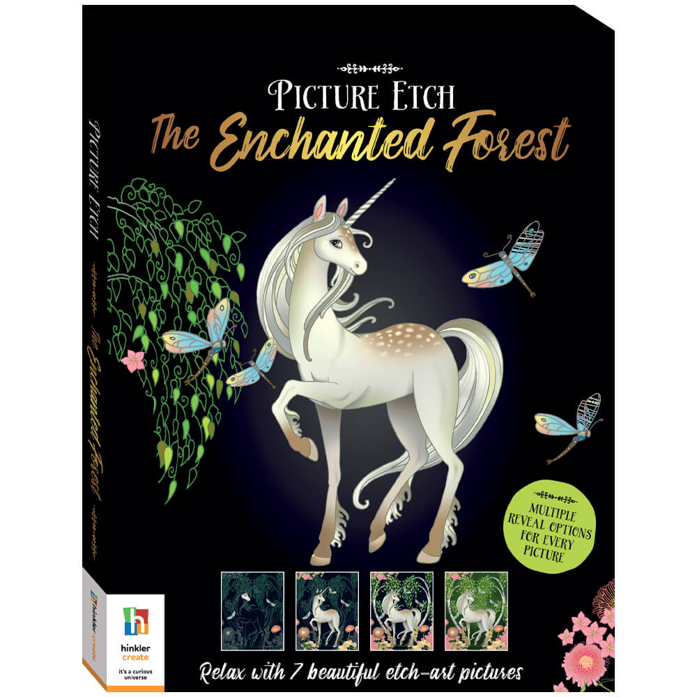 Create beautiful pieces of art with just a scratch tool! Using the tool supplied, scratch away the black art on the inside panels to discover brightly coloured patterns and motifs hidden underneath. It’s up to you: you can scratch away all of the black layer, reveal a few details that you want to highlight, or create your own patterns on the beautiful images inside. Includes: • 1 x etching stylus • 7 x scratch panels • 1 x information sheet Slow down and etch away your worries with Enchanted Forest! Product Information: • ISBN: 9354537006341 • Author: Hinkler Books • Publisher: Hinkler Books • Format: Box Set • Measurements: 23 x 18.5 x 1.4cm
