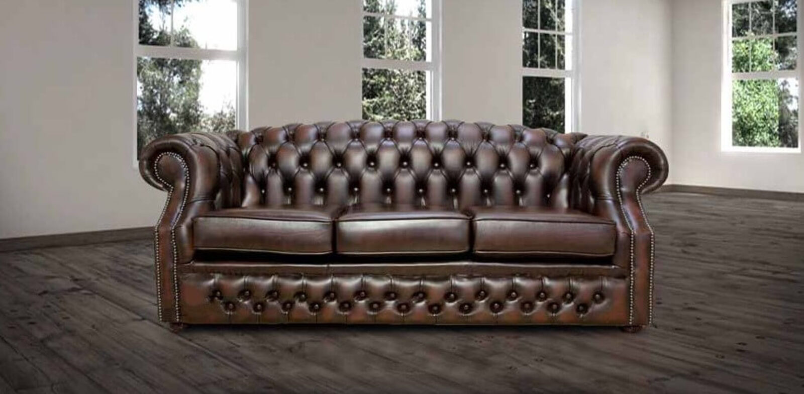 HANDCRAFTED IN ENGLAND The Chesterfield Oxford Classic Sofa. The Chesterfield Buckingham Leather Sofa with it\'s unique Raised Back, Deep Buttoned Arms and Back complemented with a Buttoned Front Border. The Scroll Fronted arms on the Chesterfield Leather Sofa are attractively embellished with lines of individual stud nails. An undoubted winner in any room from the cottage to the boardroom. A classic of its kind ;Traditional Vintage British Style. - Handmade in Antiqued Brown Leather carefully rubbed to highlight the appearance of ageing - Non Tropical Screwed and glued hardwood frame made in house - Upholstered and buttoned by craftsmen - Real wood Bunfeet - Hand studded - From construction of the frame to filling in the cushions all is completed in house. - Individual seating options (Fibre, Medium, Firm) - Payment Option 50% Deposit Rest of Balance On Delivery - Free Swatch Service - 12 Month Manufacturers Guarantee - 10 Year Manufacture Guarantee on Framework - Manufactured…