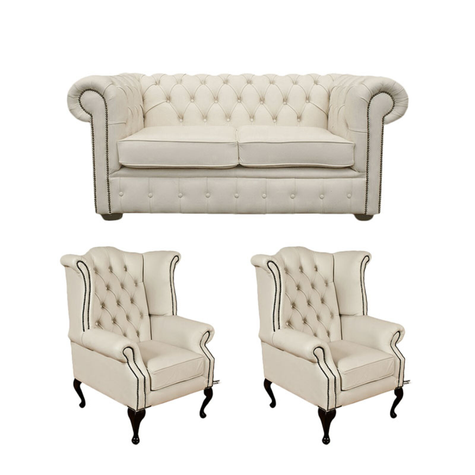 HANDCRAFTED IN ENGLAND The Chesterfield Classic Suite available in 2 + 2 x queen anne Chairs (Two Seater Settee + 2 x queen anne Chair). The Chesterfield Leather Sofa with it\'s unique Low Back Style, Deep Buttoned Arms and Back complemented with a Buttoned Front Border. The Scroll Fronted arms on the Chesterfield Leather Sofa are attractively embellished with lines of individual stud nails. An undoubted winner in any room from the cottage to the boardroom. A classic of its kind Traditional Vintage British Style. INTERNATIONAL SHIPPING: For a rough guide to the cost of Worldwide Shipping please click here (*1). PLEASE NOTE: WE ALSO MANUFACTURE 2.5 SEATER CHESTERFIELDS. PLEASE CONTACT US ON 01254 268590 FOR MORE INFORMATION Our Chesterfield Sofas have previously featured on ITV s 60 Minute Make Over programme. Click Here (*2) to view our Chesterfield Wing Chair on the Fox\'s Biscuit adverts. For a LIMITED PERIOD ONLY buy our Exclusive Classic Chesterfield Suites for Half Price…