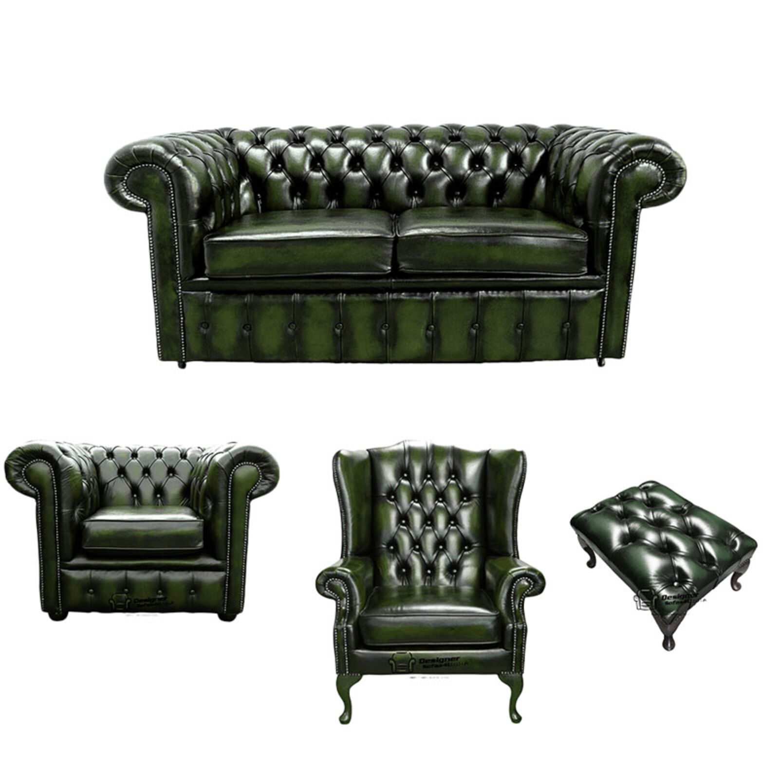 HANDCRAFTED IN ENGLAND The Chesterfield Classic Suite available in 2 + 2 x Club Chairs + Footstool (Two Seater Settee and 2 x Club Chairs + Footstool). The Chesterfield Leather Sofa with it\'s unique Low Back Style, Deep Buttoned Arms and Back complemented with a Buttoned Front Border. The Scroll Fronted arms on the Chesterfield Leather Sofa are attractively embellished with lines of individual stud nails. An undoubted winner in any room from the cottage to the boardroom. A classic of its kind Traditional Vintage British Style. INTERNATIONAL SHIPPING: For a rough guide to the cost of Worldwide Shipping please click here (*1). PLEASE NOTE: WE ALSO MANUFACTURE 2.5 SEATER CHESTERFIELDS. PLEASE CONTACT US ON 01254 268590 FOR MORE INFORMATION Our Chesterfield Sofas have previously featured on ITV s 60 Minute Make Over programme. Click Here (*2) to view our Chesterfield Wing Chair on the Fox\'s Biscuit adverts. For a LIMITED PERIOD ONLY buy our Exclusive Classic Chesterfield Suites…