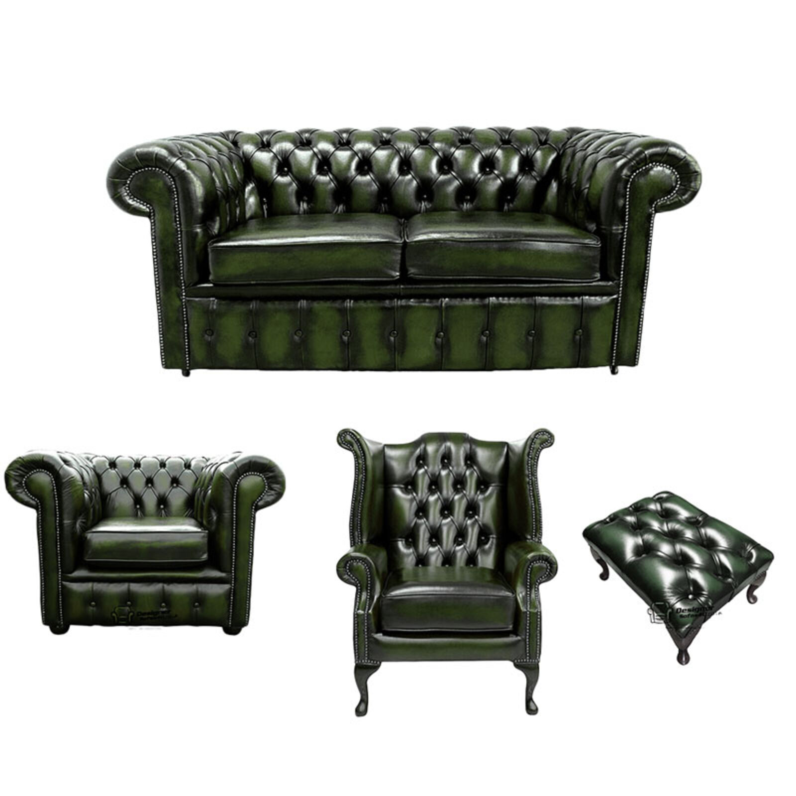 HANDCRAFTED IN ENGLAND The Chesterfield Classic Suite available in 2 + 2 x Club Chairs + Footstool (Two Seater Settee and 2 x Club Chairs + Footstool). The Chesterfield Leather Sofa with it\'s unique Low Back Style, Deep Buttoned Arms and Back complemented with a Buttoned Front Border. The Scroll Fronted arms on the Chesterfield Leather Sofa are attractively embellished with lines of individual stud nails. An undoubted winner in any room from the cottage to the boardroom. A classic of its kind Traditional Vintage British Style. INTERNATIONAL SHIPPING: For a rough guide to the cost of Worldwide Shipping please click here (*1). PLEASE NOTE: WE ALSO MANUFACTURE 2.5 SEATER CHESTERFIELDS. PLEASE CONTACT US ON 01254 268590 FOR MORE INFORMATION Our Chesterfield Sofas have previously featured on ITV s 60 Minute Make Over programme. Click Here (*2) to view our Chesterfield Wing Chair on the Fox\'s Biscuit adverts. For a LIMITED PERIOD ONLY buy our Exclusive Classic Chesterfield Suites…