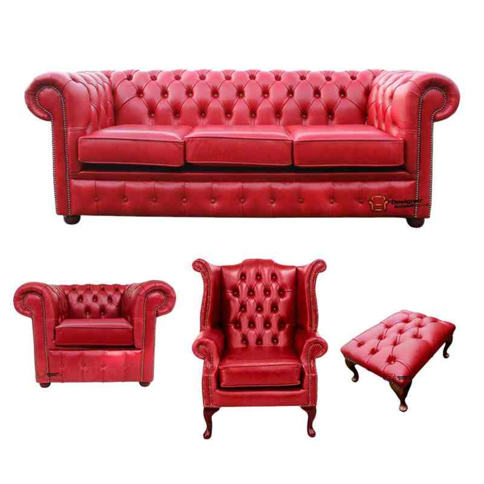 HANDCRAFTED IN ENGLAND The Chesterfield Classic Suite available in 3 + 2 x Club Chairs + Footstool (Three Seater Settee and 2 x Club Chairs + Footstool). The Chesterfield Leather Sofa with it\'s unique Low Back Style, Deep Buttoned Arms and Back complemented with a Buttoned Front Border. The Scroll Fronted arms on the Chesterfield Leather Sofa are attractively embellished with lines of individual stud nails. An undoubted winner in any room from the cottage to the boardroom. A classic of its kind Traditional Vintage British Style. INTERNATIONAL SHIPPING: For a rough guide to the cost of Worldwide Shipping please click here (*1). PLEASE NOTE: WE ALSO MANUFACTURE 2.5 SEATER CHESTERFIELDS. PLEASE CONTACT US ON 01254 268590 FOR MORE INFORMATION Our Chesterfield Sofas have previously featured on ITV s 60 Minute Make Over programme. Click Here (*2) to view our Chesterfield Wing Chair on the Fox\'s Biscuit adverts. For a LIMITED PERIOD ONLY buy our Exclusive Classic Chesterfield Suites…